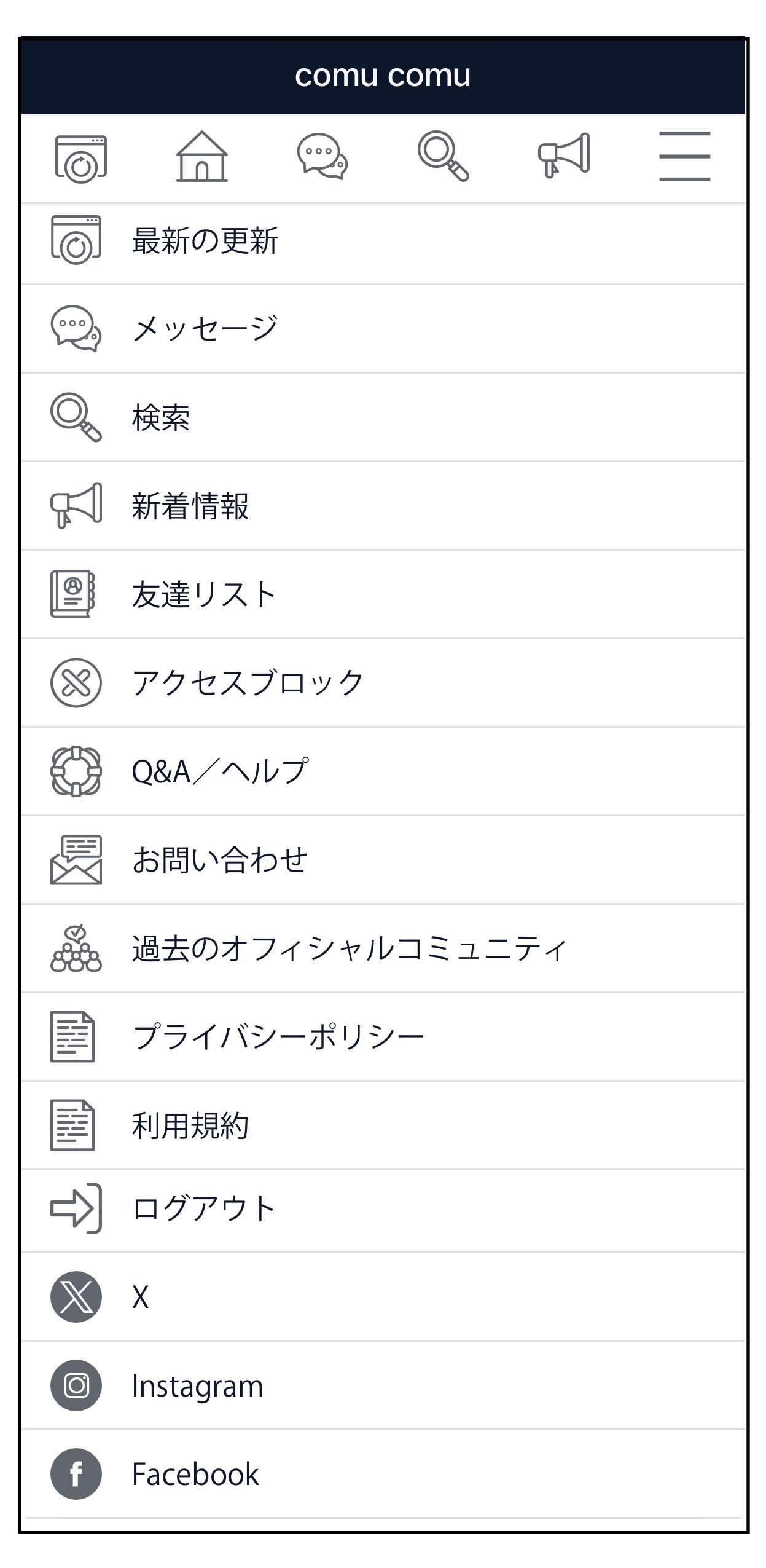 メニューには、comu comuを利用するための便利な機能や情報がたくさん。