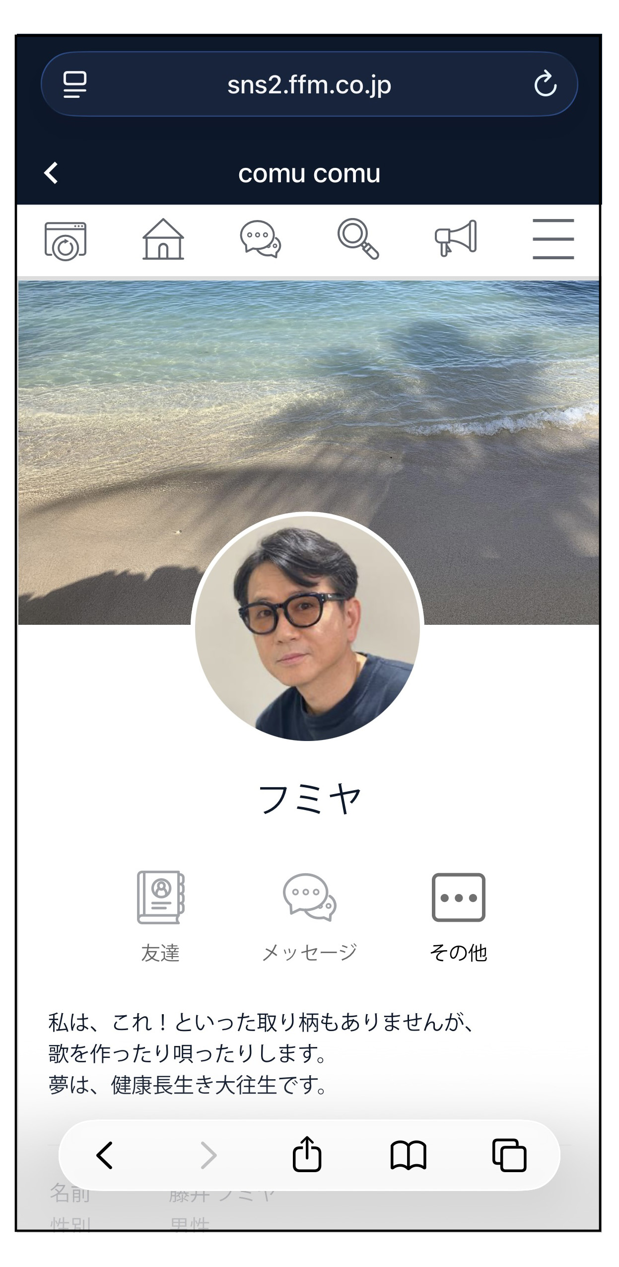 コメントや投稿を見て、「この人と連絡を取りたいな」という方がいた場合、友達になりたい方のマイページにアクセスし、アイコンをタップして友達申請を送ります。ただし、面識がない場合はすぐに友達申請はせずに、まずは日記にコメントを入れてみるなどして交流を持つようにしましょう。原則として、交流のない方への突然の友達申請はお控えください。