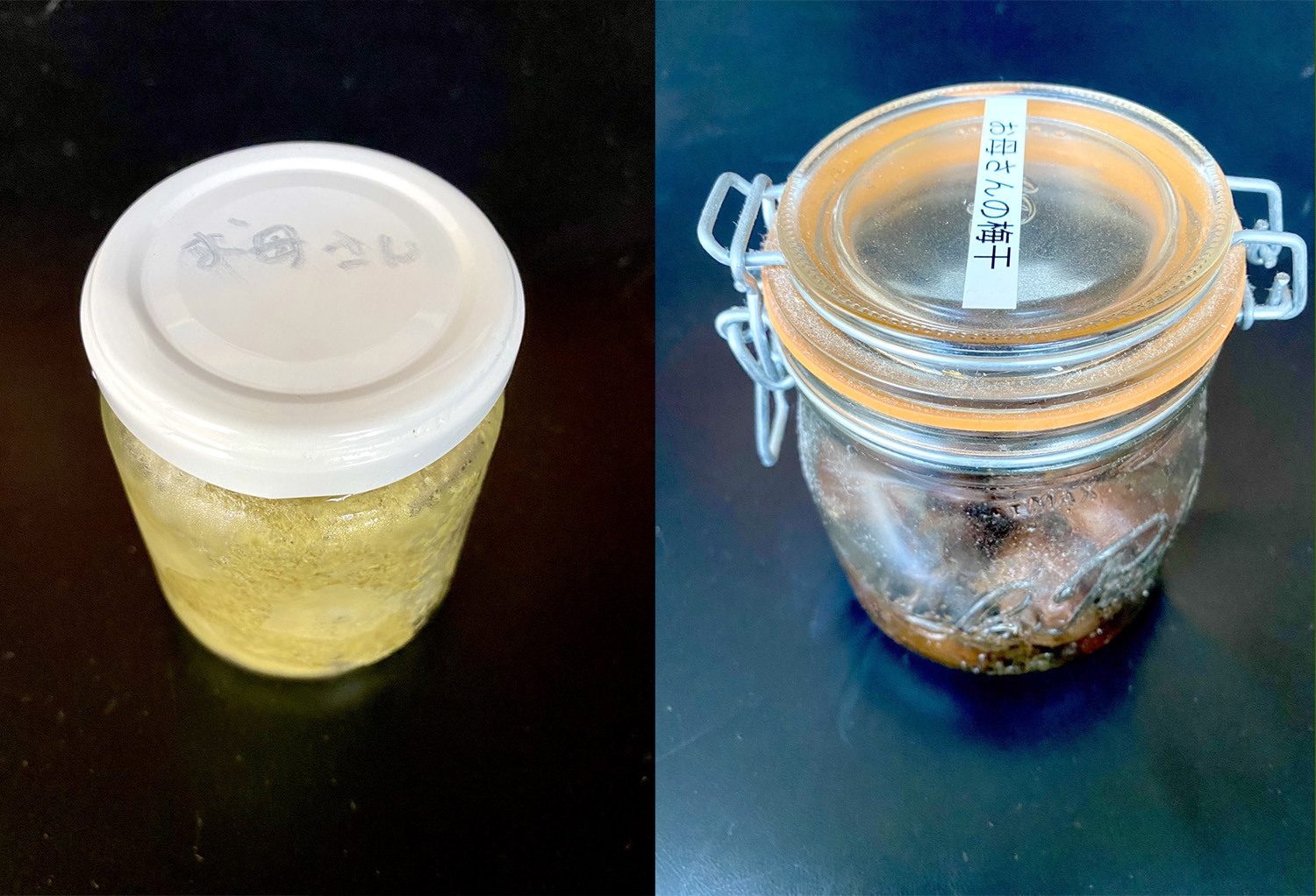 それは、柚子胡椒と梅干し。遥か昔に母親が作って東京に送ってくれた瓶詰めである。柚子胡椒は冷凍保存、梅干しは常温保存。一応おふくろの手作りの味である。これがもう最後だなぁと大切に食べていたが、今ではもったいないというか、なんとなく形見のようで手が出せない。食べ物の形見は、物の形見より、なんとも言えぬリアル感がある。この先、食べることがあるのだろうか? これを子供たちに託しても仕方がないので、いつかは食べる時が来るのだろう。はたして今でもちゃんと食べられるのか。既製品ならとうに賞味期限は過ぎている。まぁ明太子のような生ものでもないし、どちらも植物の塩漬けなので大丈夫だとは思うが……。