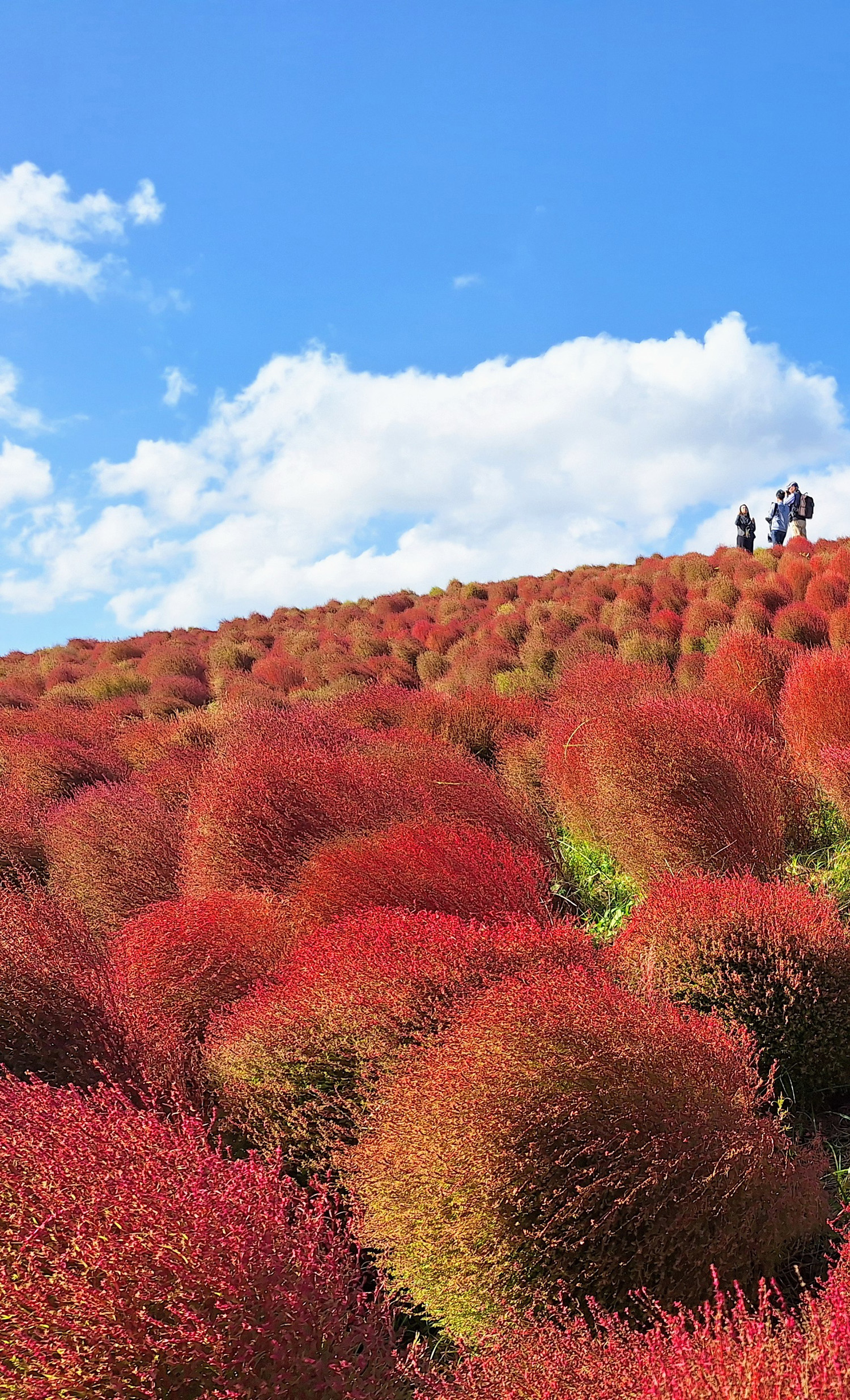 ふんわり紅く色づいた、まあるいコキア。小さな秋が集まって、丘いっぱいの大きな秋になったみたい。風にゆられて、秋の足音が聞こえてきました。
