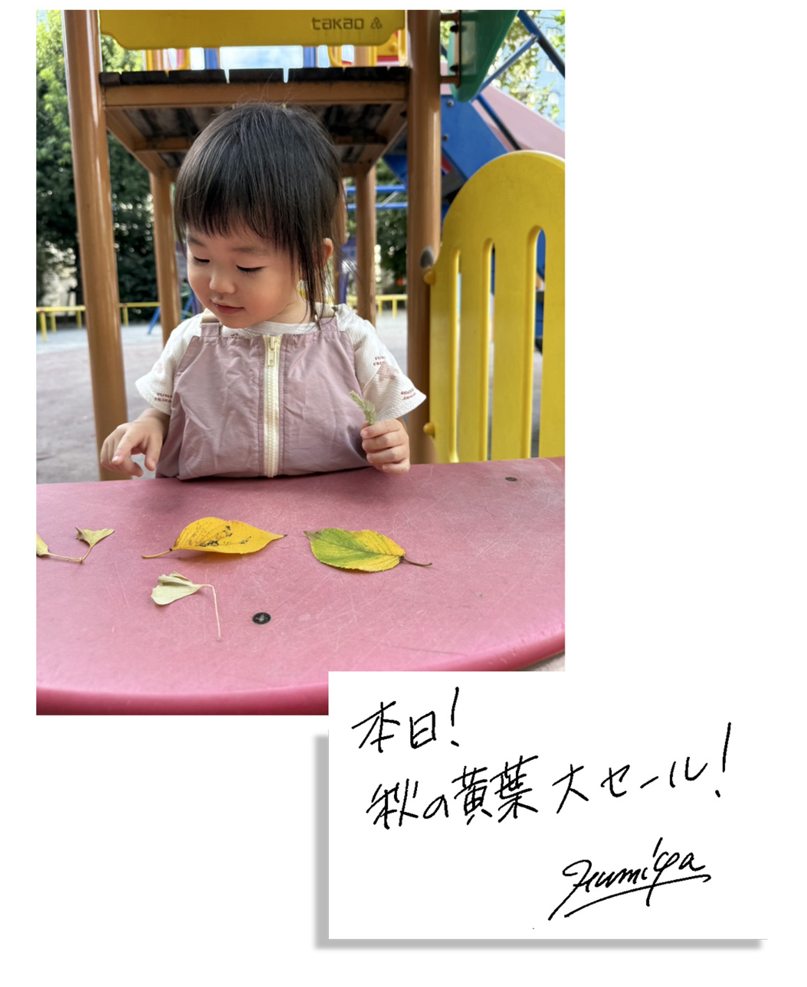 1歳9ヶ月の孫娘と公園に行った時です。葉っぱでお店屋さんごっこです。