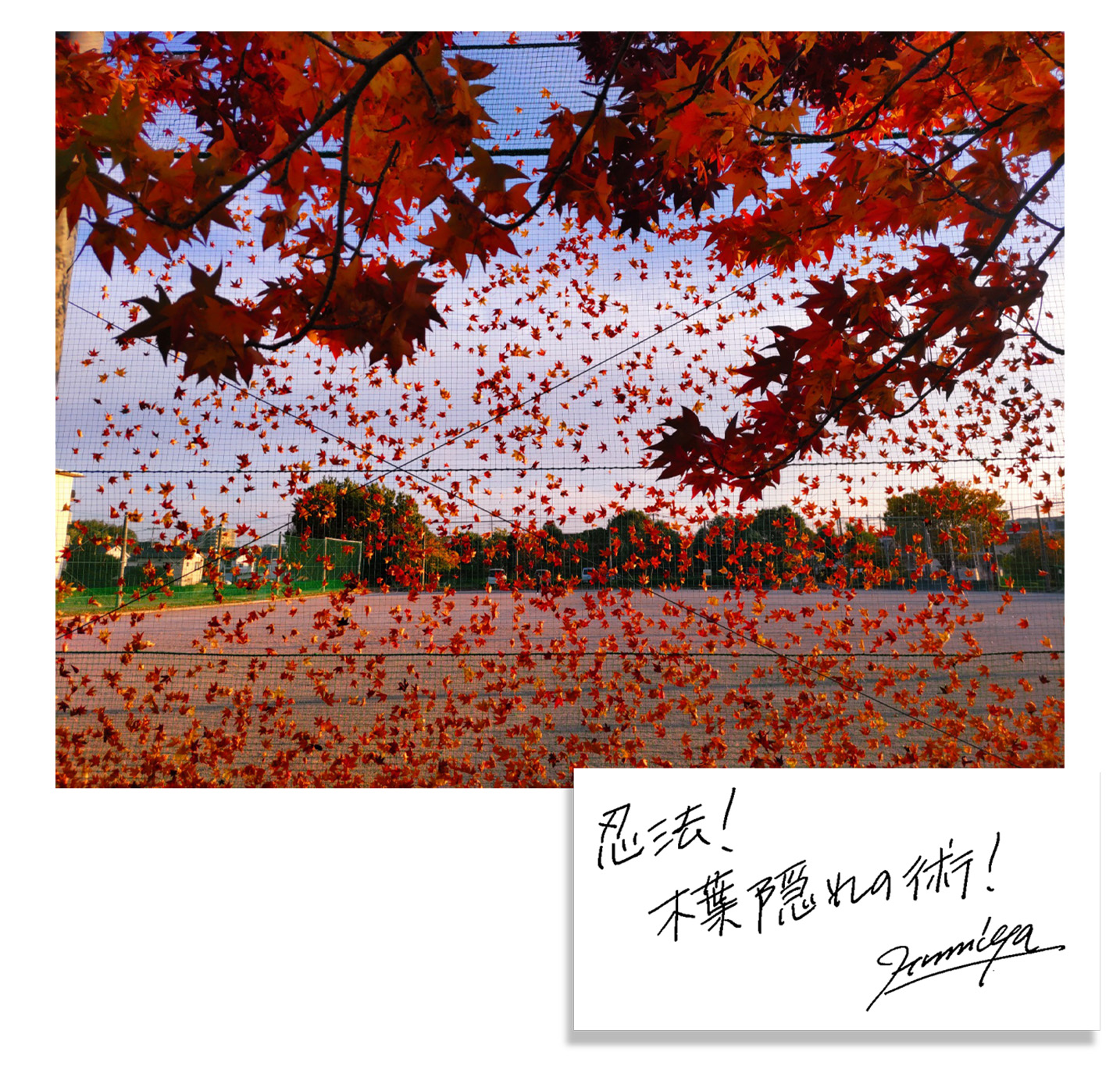 木枯らし1号が吹いたら、奇跡のカーテンの出来上がり。小さい秋見~つけた。(木枯らし1号が吹いた日、グラウンドの金網に風で舞った枯れ葉が絡み付いて、この日にしか見れない景色が見えるのです)